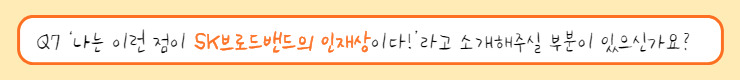 SK브로드밴드 상품/서비스를 이용하고 있었던 지원자의 경우 본인만의 시각으로 자유롭게 이용 경험에 대한 한 줄 평을 작성해주시면 됩니다. 물론 지원 직무 관점에서 유의미한 시사점을 던져 주는 한 줄평이면 더욱 좋겠지요?