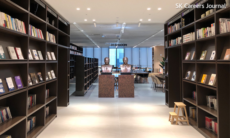 SK네트웍스 구성원들은 이곳에서 독서를 하거나 공부를 하면서, 자기계발도 하고 마음의 양식을 든든하게 쌓기도 해요. 나도 복잡한 업무에서 벗어나 잠시 책읽는 시간을 가졌는데, 아무에게도 방해받지 않고 조용한 공간에서 있으니까 저절로 힐링이 되더라고요. 나만의 오롯한 시간을 보낼 수 있는 장소가 회사에 존재한다니, 출근할 힘이 나는 것 같아요!