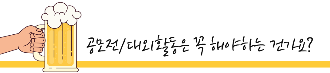 대학생활의 꽃으로는 친구들과 함께 팀을 이뤄 함께 몇 개월 간 고생하고, 그 끝에 눈물겨운 짜릿한 수상을 하는 공모전 경험을 빼놓을 수 없는데요! 그리고 다양한 대외활동 역시 요즘 대학생들이 가장 하고 싶어하는 경험 중 하나죠. 그런데, 도대체 경쟁률은 왜 이렇게 높은지, 수상도 합격도 너무 힘든 현실… 어떻게 하면 좋을까요? 함께 이야기해보도록 하겠습니다!