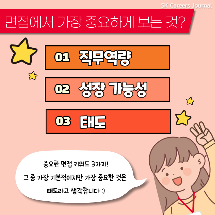 면접에서 가장 중요하게 보는 세가지는 직무 역량과 성장 가능성, 태도입니다!