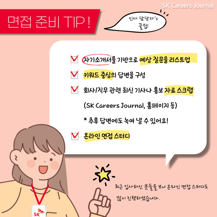 면접을 준비하시는 지원자분들께 팁을 드리자면, 자기소개서를 기반으로 예상 질문을 리스트업하고, 키워드 중심의 답변을 구성해보시면 좋을 것 같습니다. 또, 회사/직무 관련 최신 기사나 홍보 자료(SK Careers Journal, 홈페이지 등)를 스크랩하시어, 추후 답변에도 녹여 내실 수 있을 것 같습니다. 최근 입사하신 분들을 보니 온라인 면접 스터디도 많이 진행하셨던 것 같습니다.