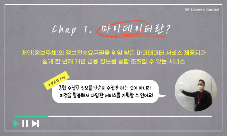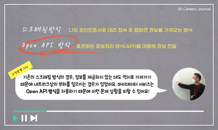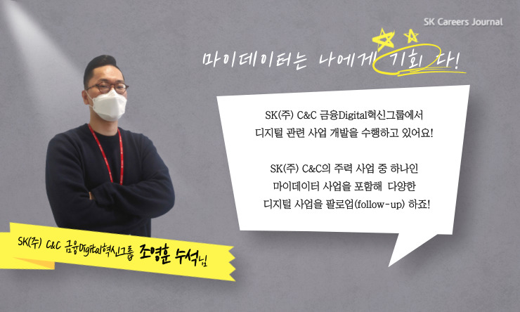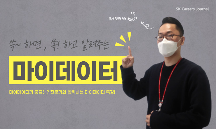 마이데이터? 그게 뭐야~? 대단한 기술이지~! 네, 마이데이터 대단한 서비스죠! 하지만 그냥 대단하기만 한 것만은 아닙니다. SK(주) C&C의 주력 사업이자 앞으로 금융을 포함한 IT 트렌드의 판도를 바꿀 마이데이터에 대해서 전문가에게 직접 물어보는 시간을 준비했어요! 씈? 하고 물으면 쏙! 하고 대답해주는 마이데이터 전문가와 직접 마이데이터에 대해 알아볼까요?