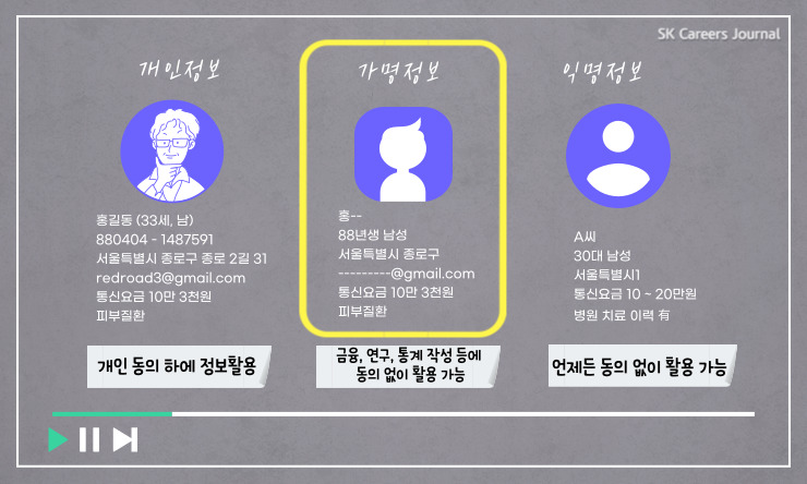 이번에 SK(주) C&C가 과학기술정통부의 가명정보 결합기관 허가를 받아 정식 사업자가 됐어요. SK(주) C&C는 마이데이터 결합을 위한 전문적인 서비스를 제공 하겠다는 목표를 가지고 있어요. 마이데이터 결합이라는 것은 산업별로 모여 있는 정보 간의 링크를 만들어주는 것이에요. SKT나 SK네트웍스 SK브로드밴드 등 관계사뿐만 아니라 가치 있는 다양한 정보를 연결해서 데이터의 묶음을 만들려고 노력하고 있죠.