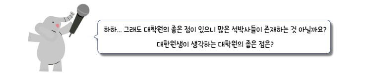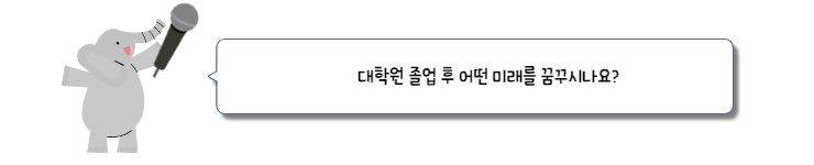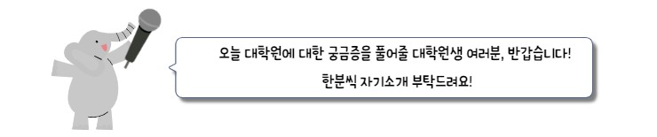 자네... 대학원에 올 생각없나...? 지금 취업과 대학원 진학 사이에서 고민하고 있나요..? 그렇지 않더라도 평소에 대학원에 대해 궁금해 할 친구들을 위해 준비했어요! 대학원생에게 묻는 대학원 라이프-☆ 대학원생은 정말 코끼리를 냉장고에 넣어야할까? 대학원에 대한 오해와 편견을 걷어내고 대학원생들에게 물어본 찐! 대학원 라이프-☆ 지금 시작합니다!