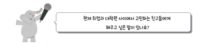 젤리 : 제가 대학원을 선택했을 때를 돌아봤을 때, 그 선택에는 부모님의 의견도 있었고, 제 선택에 영향을 준 외부의 요인들이 분명히 있었어요. 그러니까 대학원을 선택한 것이 혼자만의 결정은 아니었어요. 제가 회사에서 인턴을 하면서 느꼈던 바가 커서 최종적으로 결정을 할 때 돈, 부모님, 진로에 대해 종합적으로 고민하고 내린 결정이었어요. 지금 대학원을 고민하는 친구들이 있다면 저처럼 외부요인들이 결정에 너무 크게 영향을 미치지 않았으면 좋겠어요. 긴 인생에서 2년은 긴 기간이 아니잖아요. 크게 목표가 없다면 굳이 대학원 추천하지 않지만 정말 하고 싶은 공부가 있다면 대학원은 좋은 선택일 것 같아요. 한 번쯤은 하나에 꽂혀서 살아보는 것도 멋있잖아요?