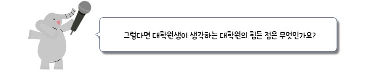 익명이 : 대학원에 오게 되면 아무래도 친구들이 주변에 하나둘씩 취업을 하게 되는데 스스로 비교를 하게 돼서 힘들더라고요. 미래의 불확실성에 대한 두려움도 항상 있는 것 같아요. 그리고 학부생 때와 달리 대학원에 오면 단체생활을 하게 되는데 인간관계에서 오는 스트레스도 있고, 연구실마다 다르겠지만 업무적 강도, 교수님 등... 그런 여러 가지 부분에 있어서 좀 힘든 것 같습니다.