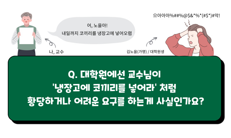 익명이 : 대학원은 진짜 교수님 바이 교수님이라 ‘이건 오해다!’라고 할만한 건 없는 것 같아요. 인터넷에 떠돌아다니는 밈들 속 그런 안 좋은 교수님도 분명 존재는 하시기 때문에... (웃음) 하지만 모든 교수님들이 그런 건 아니에요.