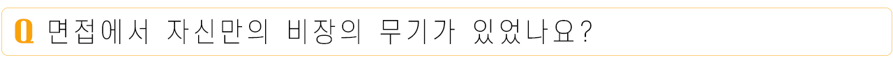 한나 저는 집에서 면접을 봤는데요, 익숙한 공간이 주는 편안함 덕분인지 크게 긴장하지 않고 면접을 볼 수 있었습니다. 뿐만 아니라, 면접 환경을 제가 직접 만들 수 있다는 점도 크게 도움이 되었어요. 예를 들어, 저는 노트북 옆에 ‘두괄식으로 또박또박 답하기’ 이라는 메모를 크게 적어 붙여 뒀는데요, 면접 대기 중에 계속 읽으면서 떨리는 마음을 가라앉히고 마인드 셋을 하는데 큰 도움이 되었답니다!