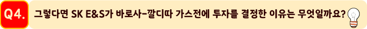SK E&S는 바로사-깔디따 투자 이전에는 주로 터미널, 도시가스 및 발전소 등 Mid 및 Downstream 분야에 주로 사업을 활발하게 진행해 왔습니다. Downstream에 필요한 가스를 안정적으로 공급하고, 가격 경쟁력을 확보하기 위해 LNG Value Chain 구축을 계획하였고, 가스전 투자를 결정하였습니다.
