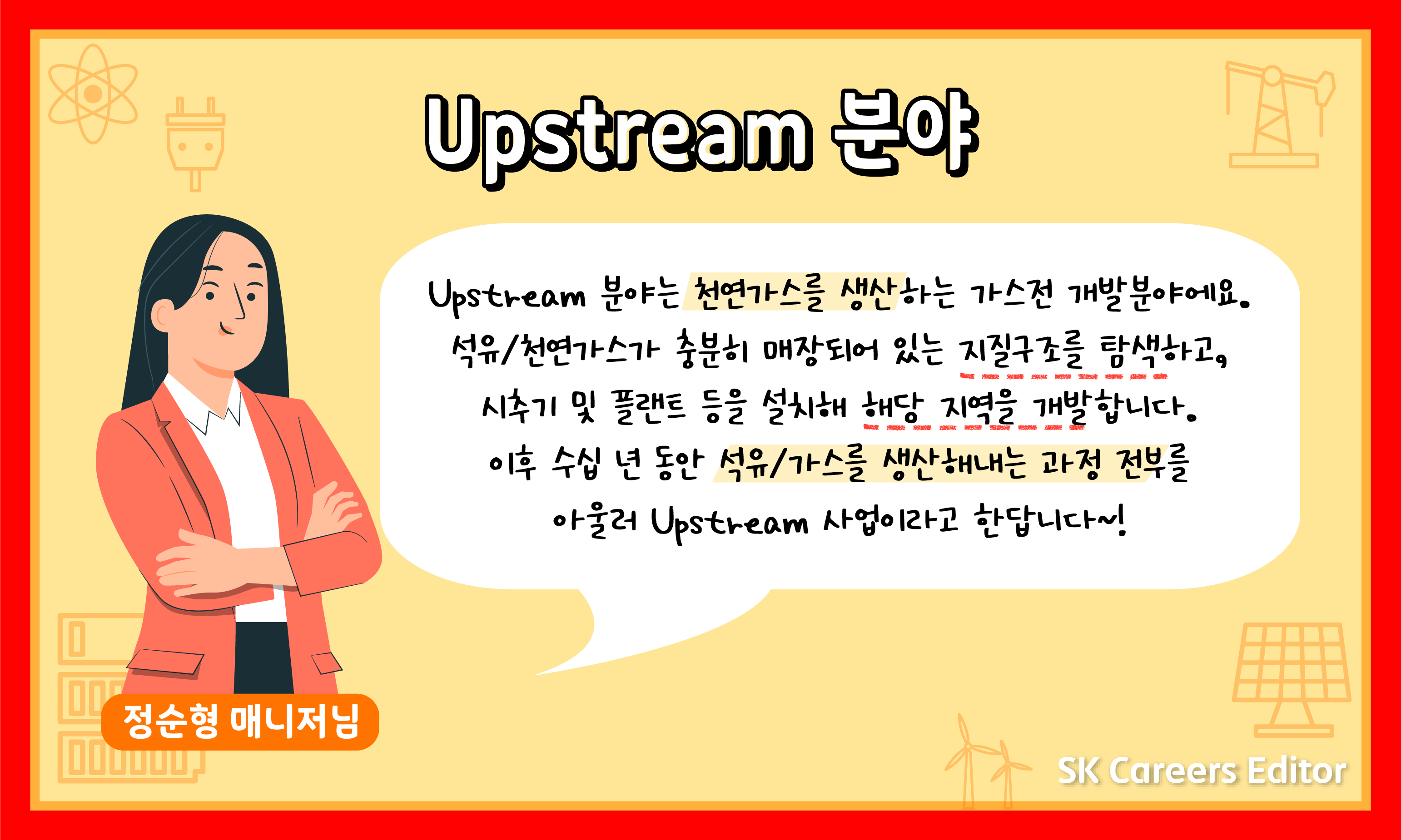 Upstream분야는 전문 용어가 많아 처음 접했을 때 생소한 부분이 많습니다. 관련 분야에 대한 기사 탐색 등 꾸준한 관심이 필요합니다. 이공계열 학생들의 경우 Upstream분야의 전공지식을 쌓는 부분이 중요하다고 생각합니다. 지질학, 석유/가스공학, 생산공학 및 설비공학에 대해 일정 지식 수준을 필요로 합니다. 사업 관리 분야의 경우 사업 경제성 평가, E&P 계약 및 프로젝트 관리에 대한 역량을 쌓으면 도움이 될 것 같습니다. 그리고 대부분 해외사업이라 거의 모든 문서 및 회의가 영어로 진행되므로 어학 능력도 중요합니다.
