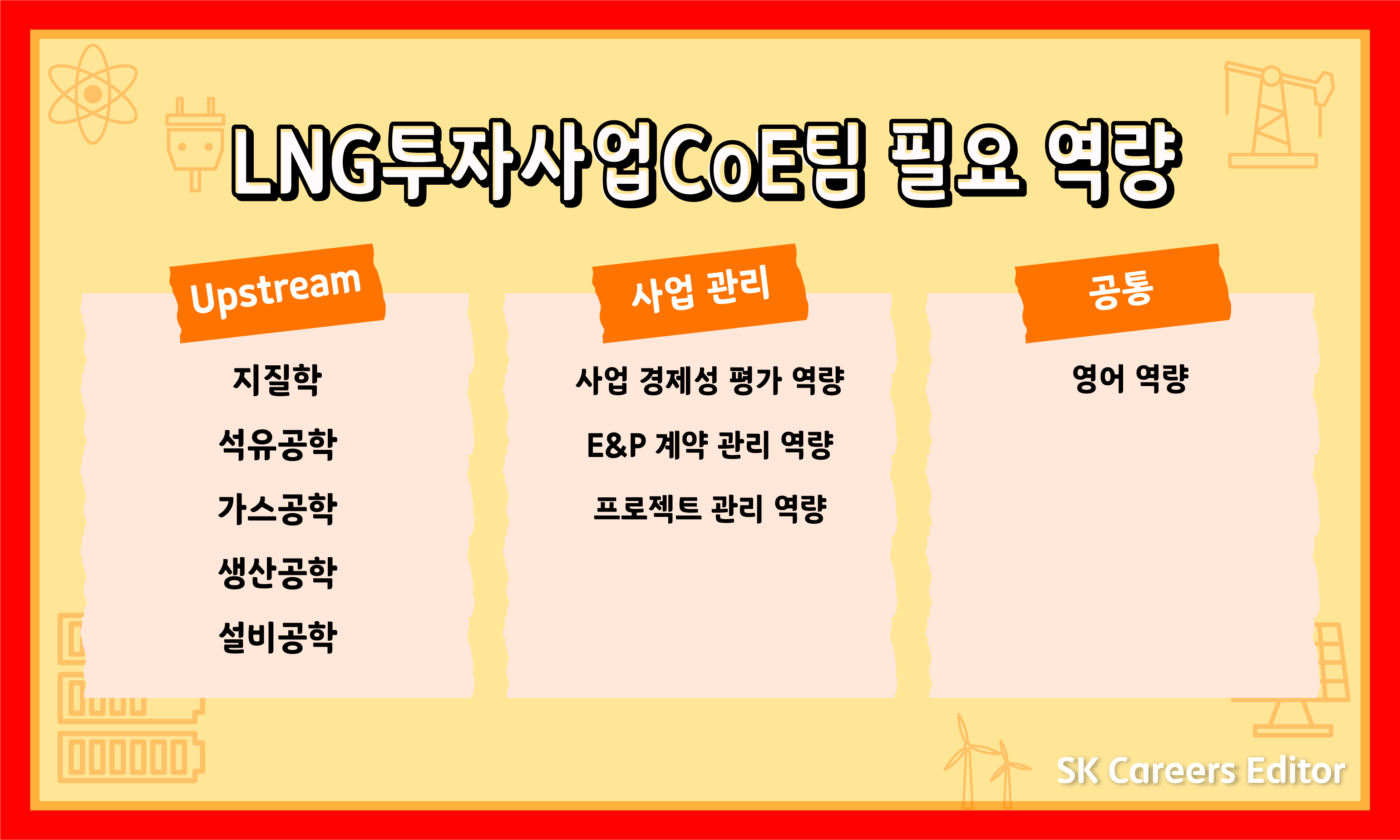 저는 대학에서 석유가스공학을 전공하였고 당시 Upstream분야에 활발하게 투자하기 시작한 SK E&S에 관심을 가지게 되었습니다. 당시 선배들은 주로 오일 위주의 사업을 하는 회사에 많이 종사하였는데, 기후변화로 인해 천연가스가 앞으로 주목받을 것이라고 생각하였고 SK 그룹 내에서 LNG 개발을 담당하는 SK E&S에 지원하게 되었습니다.