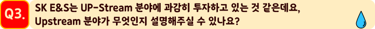 SK E&S는 LNG 사업의 수직계열화 (LNG Value Chain)을 통해 경쟁력 있는 LNG를 도입하려고 노력해왔습니다. LNG Value Chain은 크게 Upstream, Midstream, Downstream으로 구성됩니다. Upstream분야는 천연가스를 생산하는 가스전 개발 분야로 E&P (Exploration & Production) 분야라고도 합니다.