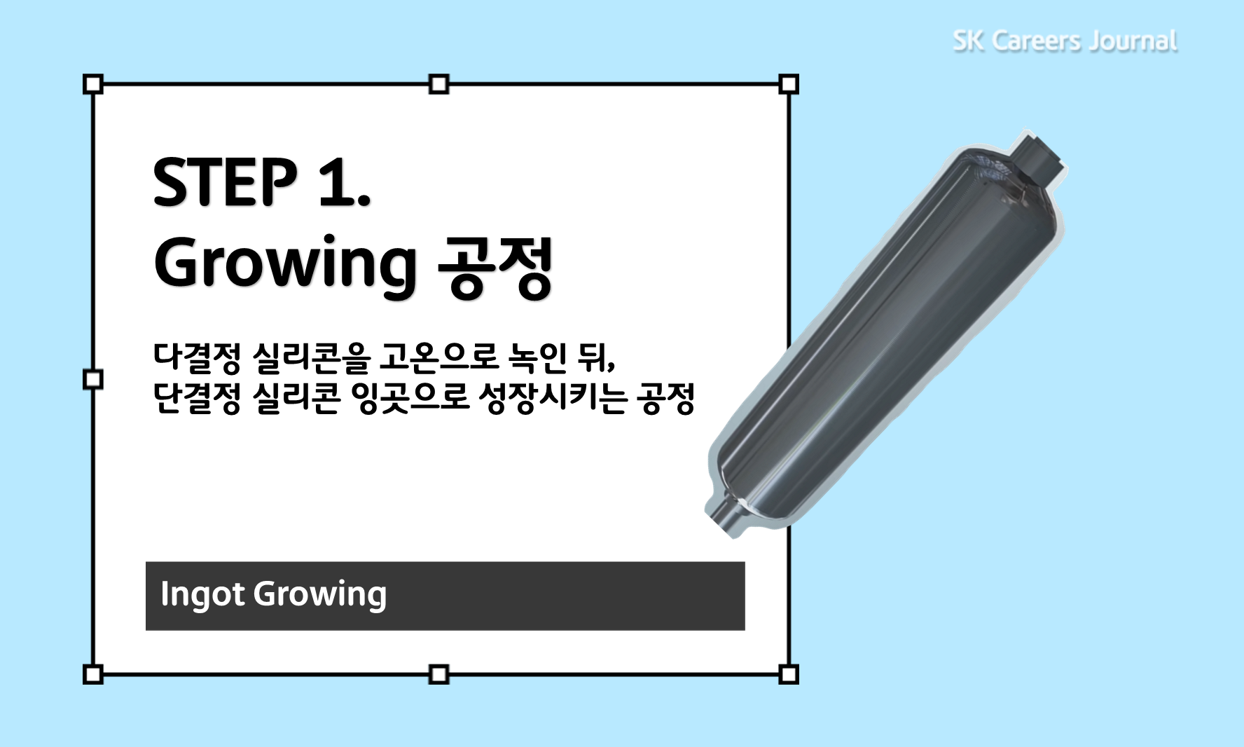 얇은 원판 형태의 웨이퍼는 원기둥 모양의 잉곳을 잘라서 만들게 되는데요. 웨이퍼의 원재료인 폴리실리콘을 매우 높은 온도에서 녹인 다음 CZ Method(쵸크랄스키법)으로 단결정 실리콘을 성장시키면 잉곳이 완성됩니다. 단결정 성장은 상당히 까다로운 공정이고, 높은 기술력이 필요하기 때문에 국가 핵심기술로 지정되기도 했지요.