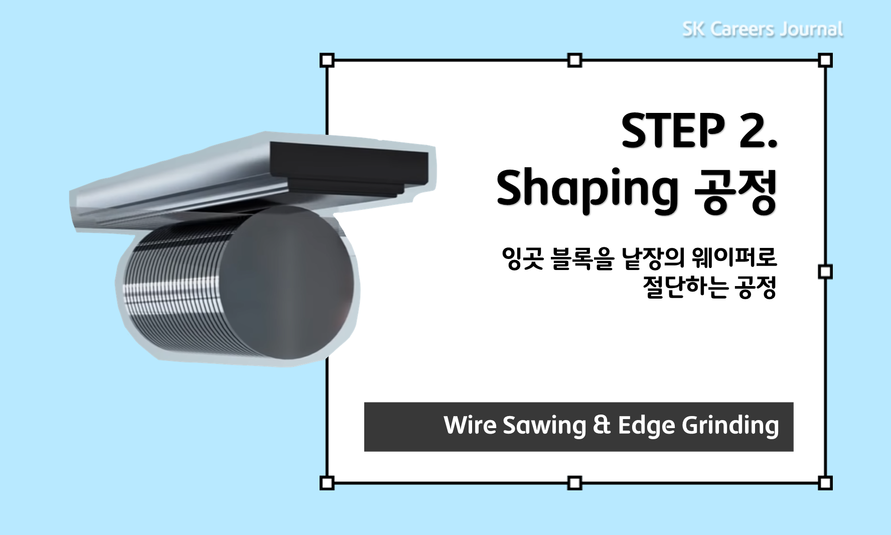 Shaping 공정은 블록 형태의 잉곳을 웨이퍼 형태로 만드는 공정입니다.