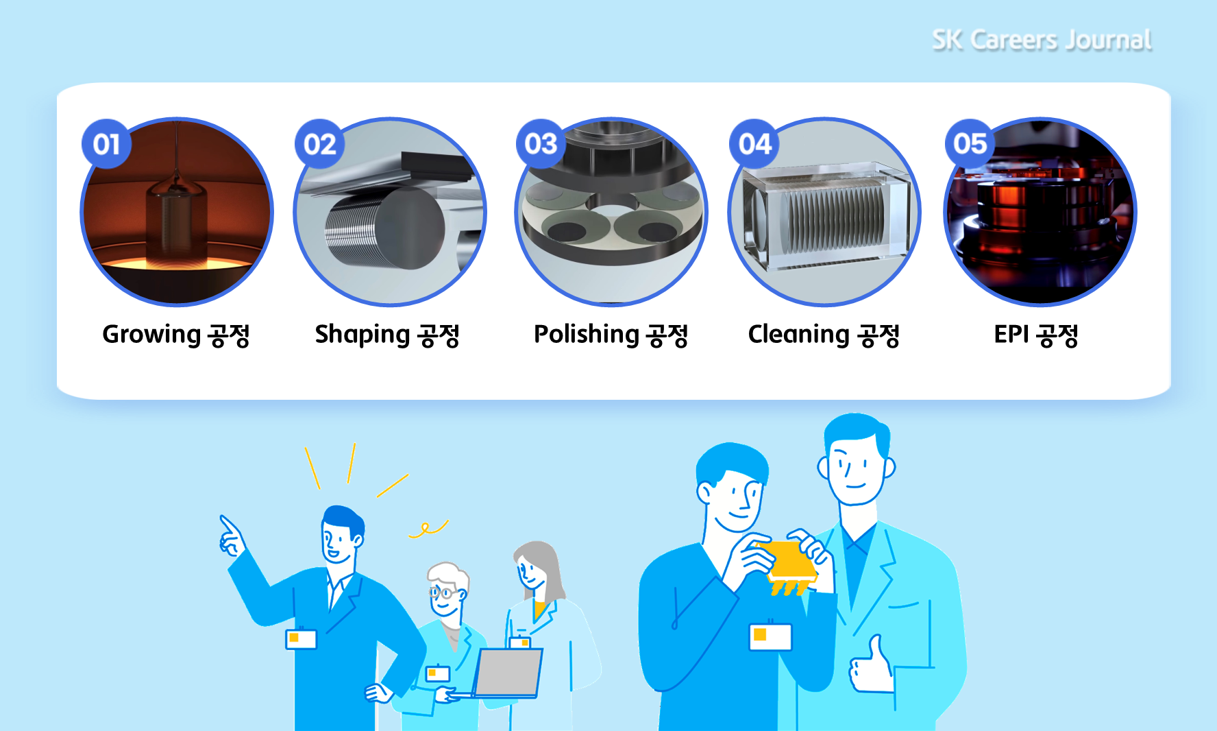 SK실트론의 웨이퍼 이야기! 지난 시간에는 웨이퍼의 정의부터 재료, 명칭까지 살펴보았는데요! 이번 시간에는 웨이퍼 제조 공정에 대한 이야기를 알려드릴게요. 예비 Pro님들도 쉽게 이해할 수 있는 웨이퍼 공정 과정 이야기! 지금부터 시작해볼까요?