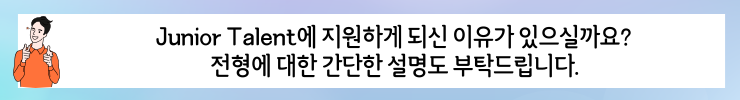 지원 분야에 관련된 인턴십과, 공모전 등 다양한 경험도 필요하다고 생각되고요. 저희가 Junior Talent 을 선택하게 된 이유는 모집 직무에 대한 설명이 구체적으로 명시되어 있어 저희가 원하는 직무라고 판단했기 때문입니다.
