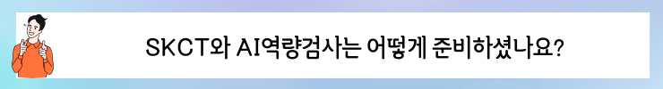 평소에도 컴퓨터 사인펜을 이용해 문제를 푼다거나 시험 시간표에 맞춰 알람이 울리게 하는 등 시간 관리를 하며 스스로 SKCT 고사장과 비슷한 환경을 만들어 준비하였습니다. 저희가 지원할 당시 AI 역량 검사 도입의 초창기였기 때문에 정보가 많지 않아서 막막했던 기억이 납니다. 유튜브를 통해 연습 문제를 풀거나 후기 영상들을 통해 정보를 얻고자 하였습니다.