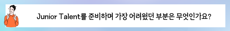 노하은 프로님 – 신서윤 프로님의 특별한 역량은 성실함 입니다. 신서윤 프로님은 모든 방면에서 뛰어난 역량을 보이는데 모든 역량은 성실함에서 나오는 것 같습니다. 무엇이든 열심히, 성실하게 해내려는 모습이 프로님의 최대 강점이라고 말할 수 있습니다. 성실함에서 비롯된 꼼꼼함과 완벽한 준비성은 신서윤 프로님이 Junior Talent 에 합격하는 과정에 가장 큰 힘이 되었을 것 입니다.