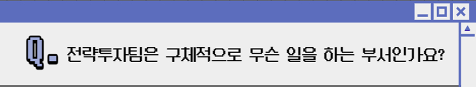 전략투자팀은 전사의 중장기 전략 중에서 Inorganic 전략을 Execute 하는 팀입니다 . 투자기회를 모색하여 기업실사 (Due Diligence) 및 가치평가 (Valuation) 수행 , 주요 바이오텍 제품의 재무적 / 비재무적 분석을 통해 투자 의사결정을 하고 바이오 / 제약 Market Intelligence 확보 , 미래 유망 기술 조기 탐색 등 우리 회사의 신성장 동력을 발굴하기 위해 다양한 일을 하고 있습니다 .