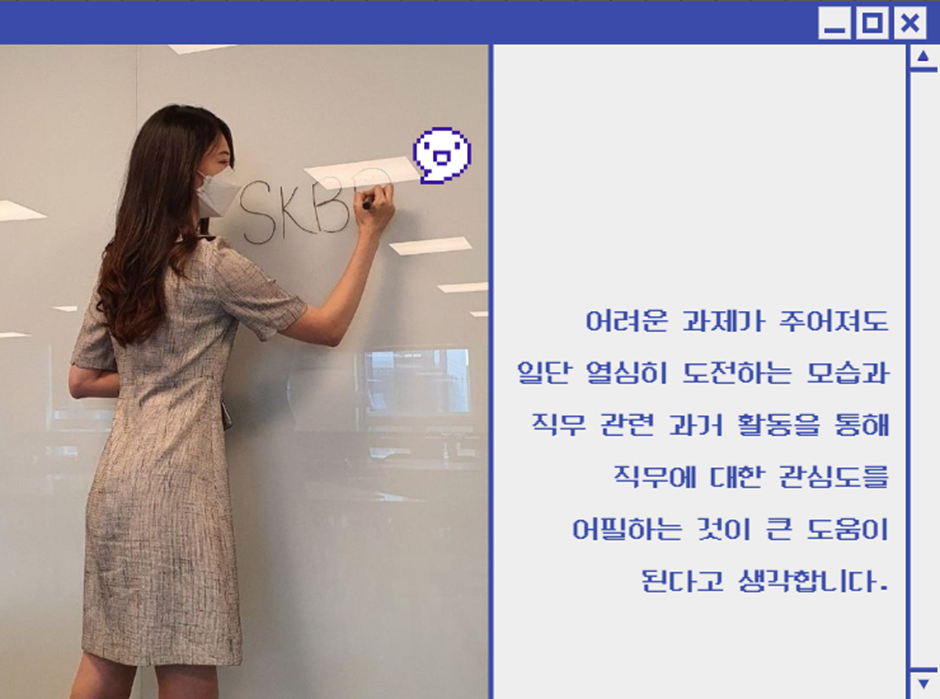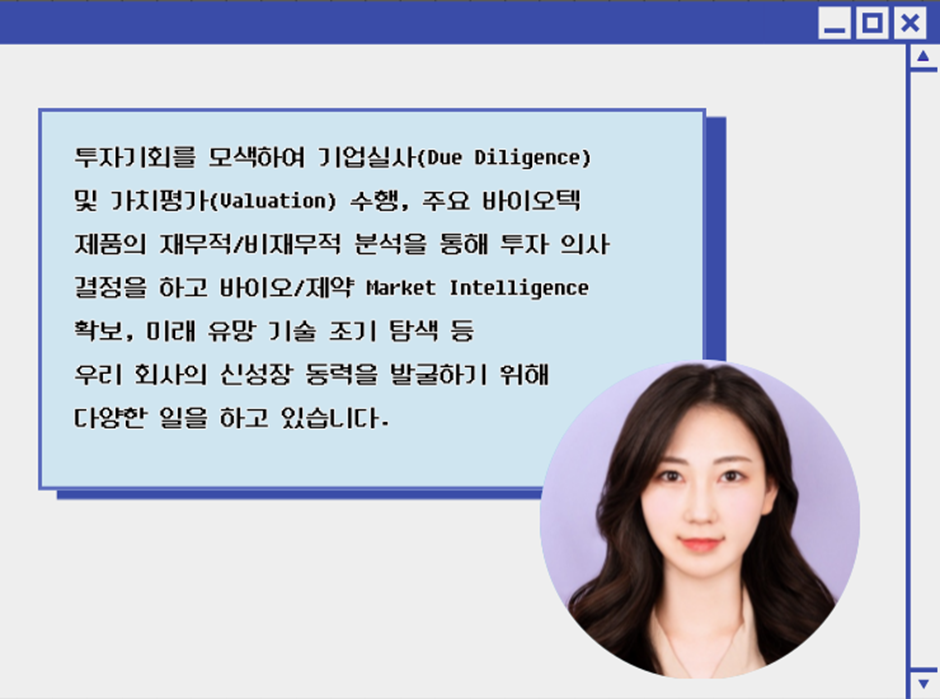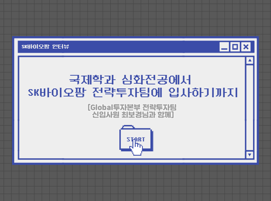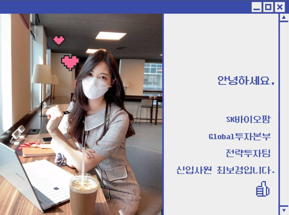 안녕하세요 , SK 바이오팜 Global 투자본부 전략투자팀 신입사원 최보경입니다 . 대학교 졸업 후 긴 여정 끝에 드디어 원하던 직무와 회사에 입사하게 되어 정말 행복합니다 .