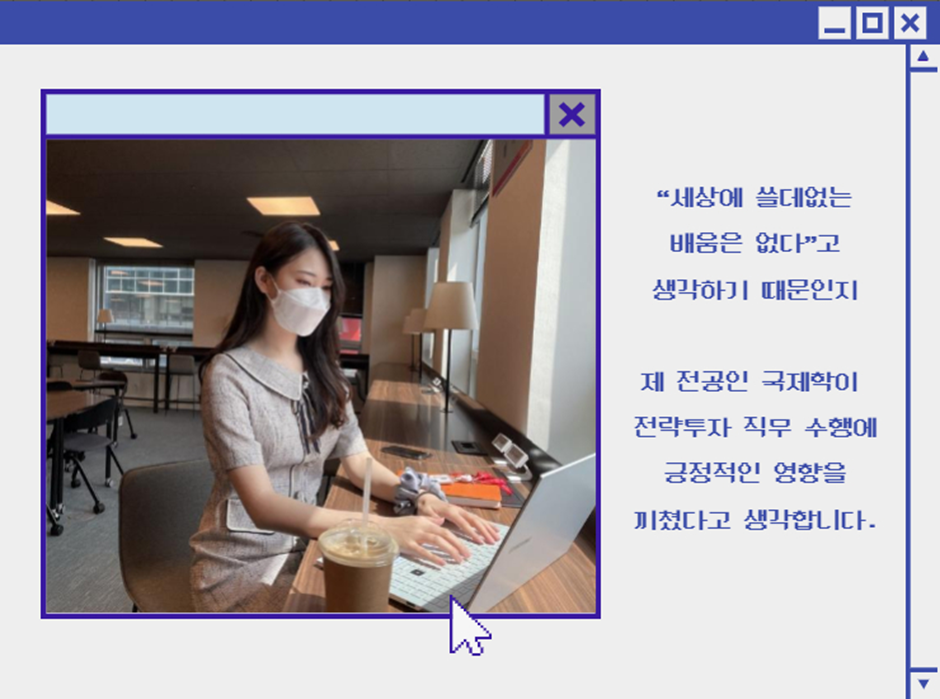 “ 세상에 쓸데없는 배움은 없다 ” 고 생각하기 때문인지 제 전공인 국제학이 전략투자 직무 수행에 긍정적인 영향을 끼쳤다고 생각합니다 . 저희 팀은 해외투자가 중심이기 때문에 국제경영 , 국제금융 , 국제경제 등에 대한 이해가 유익하게 작용했습니다 . 또한 , 국제관계 , 국제개발 관련 지식과 관심은 제약 / 바이오 산업에 많은 영향을 끼치는 국가별 보건정책 등 다양한 해외 정책들의 동향 파악에도 많은 도움이 됐습니다 .
