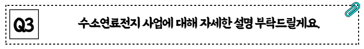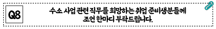 미국 또는 유럽은 이미 오래 전부터 수소 및 연료전지 관련 기술을 발전시키고 사업에 투자하고 있습니다. 앞으로 취업 준비생분들께서 수소 사업에 보다 많은 관심을 가져주시고 많은 인재분들이 합류해 주셔서 앞으로 한국도 어디에도 뒤지지 않는 경쟁력을 갖추게 되었으면 좋겠다는 소망이 있습니다. 그래서 조언이라기보다는 부탁을 드리고 싶네요. 많이 응원해 주시고 그리고 지원도 부탁드립니다.