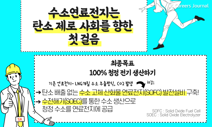 SK에코플랜트의 연료전지는 고체산화물 방식으로서 친환경, 고효율이라는 장점을 가지고 있습니다. 하지만 현재 대부분의 연료전지는 LNG를 *개질하여 수소를 추출하고 있어 CO2 발생이라는 한계를 안고 있습니다. 이러한 문제를 해결하기 위해 최근 탄소 배출 없는 수소 고체 산화물 연료전지(SOFC) 발전설비를 구축하고 실증사업에 돌입했습니다. 하지만 여기에 주입하는 수소도 깨끗한 수소를 넣어야 진정한 친환경 발전이 되겠지요? 그래서 앞으로는 수전해기(SOEC:Solid Oxide Electrolyzer)를 통해 수소를 생산하여 이것을 연료전지에 공급함으로써 100% 청정 전기를 생산하는 것이 최종 목표입니다.