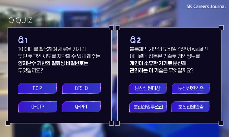 언어유희 같은 황당한 선택지만 빼도 정답이 보이죠? 정답은 Q-OTP와 분산신원인증이었습니다. 양자보안을 잘 모르는 사람도 Q 퀴즈를 풀어보며 보안 강자가 될 수 있는 시간이었습니다. 이제 양자보안 기술에 대해 살짝 알아봤으니 갤럭시 퀀텀2가 어떤 스마트폰인지 감이 슬슬 오시나요?