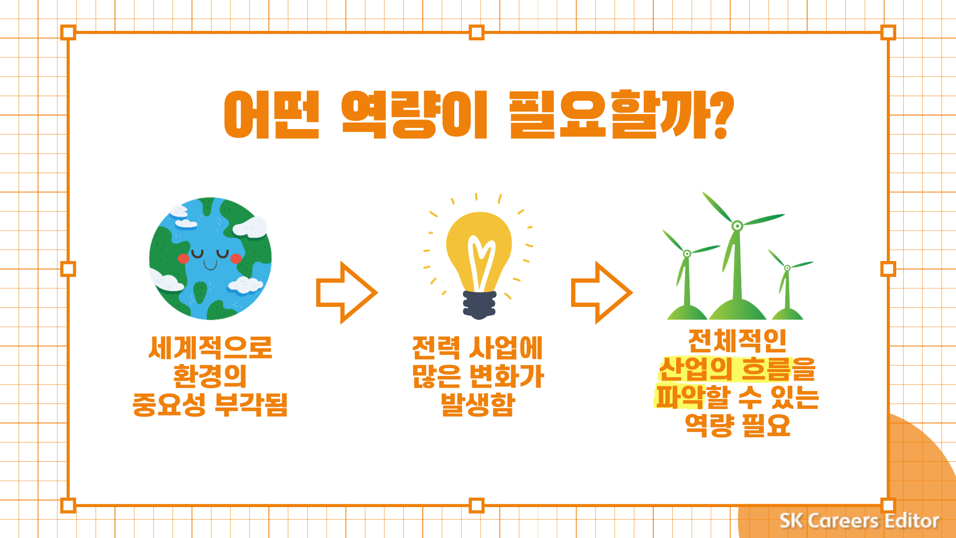 사회적으로 환경에 대한 중요성이 부각되면서, 전력 산업에도 많은 변화가 발생하고 있습니다. 이러한 변화 속에서 산업의 전체적인 흐름을 볼 수 있는 역량을 키워 오신 분이라면 좋을 것 같습니다. 전력 사업 부문이기 때문에 많은 분들이 기술적인 측면의 역량을 필수적으로 생각하실 수도 있지만, 저도 문과이기 때문에 그 부분은 걱정하지 않으셔도 좋을 것 같습니다.