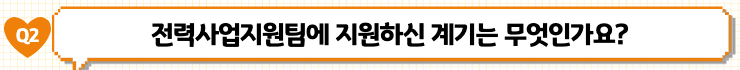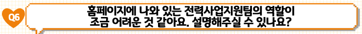 전기라는 것이 우리 생활에 필수적인 요소이지만, 전력 사업이 조금은 생소한 것 같습니다. 저도 입사 이후에 열심히 공부하는 중입니다. 저희 전력사업팀은 전력 분야의 시장 환경 및 제도 변화 등을 파악하고 이에 대응하기 위한 지원 업무를 하고 있습니다. 회사 경영을 위해서 지원 업무를 담당하는 부서가 있는 것을 생각하시면, 전력 사업을 영위하는 데 저희 전력사업지원팀이 어떤 역할을 하는지 보다 쉽게 이해하실 수 있을 것 같습니다.