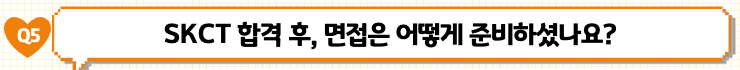 공교롭게도 다른 직무에 지원한 친구도 SKCT에 합격하게 되어, 그 친구와 같이 면접을 준비했습니다. 특별히 남들과 다른 방법으로 준비하진 않았습니다. 친구와 서로 자기소개서를 읽어주고, 어떤 부분에서 면접관분들이 궁금해 하실지 공유하면서 면접을 준비했습니다. 그 과정을 통해서 예상되는 질문을 준비해보고, 실제 면접을 보는 것처럼 연습하는 시간을 가졌습니다. 저도 취준을 처음 해보았기 때문에 다른 사람들과 거의 비슷하게 면접을 준비했습니다. 다만 면접장에 갔을 때, 나 자신을 평가받는 자리라는 생각 대신에 면접관분들과 대화를 나누는 자리라는 생각으로 면접에 임했습니다. 떨리지 않았다면 거짓말이겠지만, 이러한 마음가짐을 가졌더니 면접장에서 훨씬 차분하게 저를 표현할 수 있었던 것 같습니다.