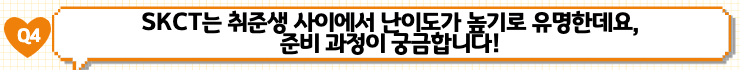 저는 꾸준하게 연습해서 문제에 익숙해지는 게 중요하다고 생각했습니다. 그래서 서류 발표 이전부터 시중에서 판매하는 문제집을 구매하여, 하루에 한 세트는 무조건 풀어보는 것을 목표로 삼았습니다. 그리고 SKCT가 문제의 난이도나 개수에 비해서 시간이 많이 부족하기 때문에 모든 문제를 잘 푸는 것보다 자신 있는 유형에 집중하는 것을 전략으로 삼았습니다. 그리고 어려운 난이도에 순응하고, 다른 사람들도 분명히 다 어려워할 것이라는 생각으로 편안하게 문제를 풀었던 것도 도움이 되지 않았나 생각이 듭니다.