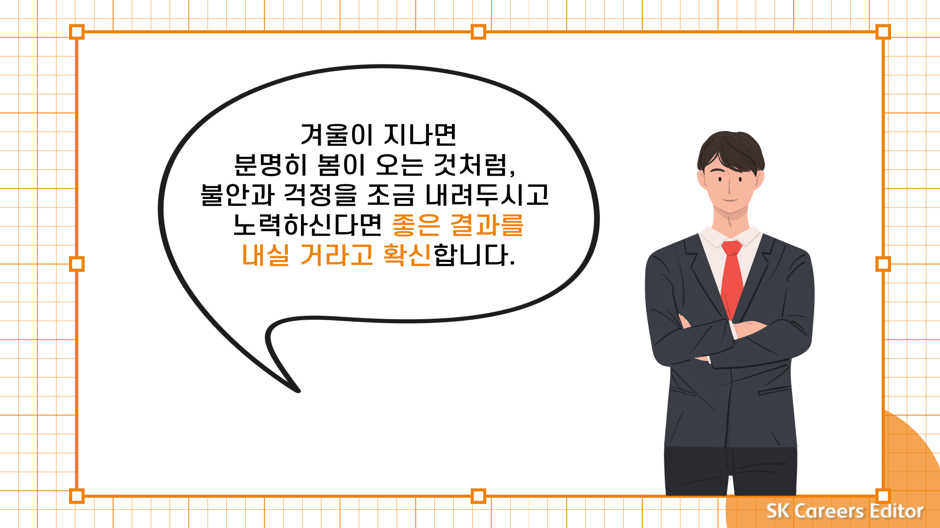 SK E&S를 꿈꾸시는 취업준비생 분들도 지금 힘든 시기를 보내시는 분들도 분명 계실 거라고 생각합니다. 하지만 겨울이 지나면 분명히 봄이 오는 것처럼, 불안과 걱정을 조금 내려두시고 열심히 노력하신다면 분명히 좋은 결과를 성취해 내실 거라고 확신합니다. 이제까지 어렵고 힘든 장애물들을 당당히 헤쳐 왔듯, 취업이라는 허들도 결국에는 당당히 넘어설 취업준비생 여러분들을 응원합니다!