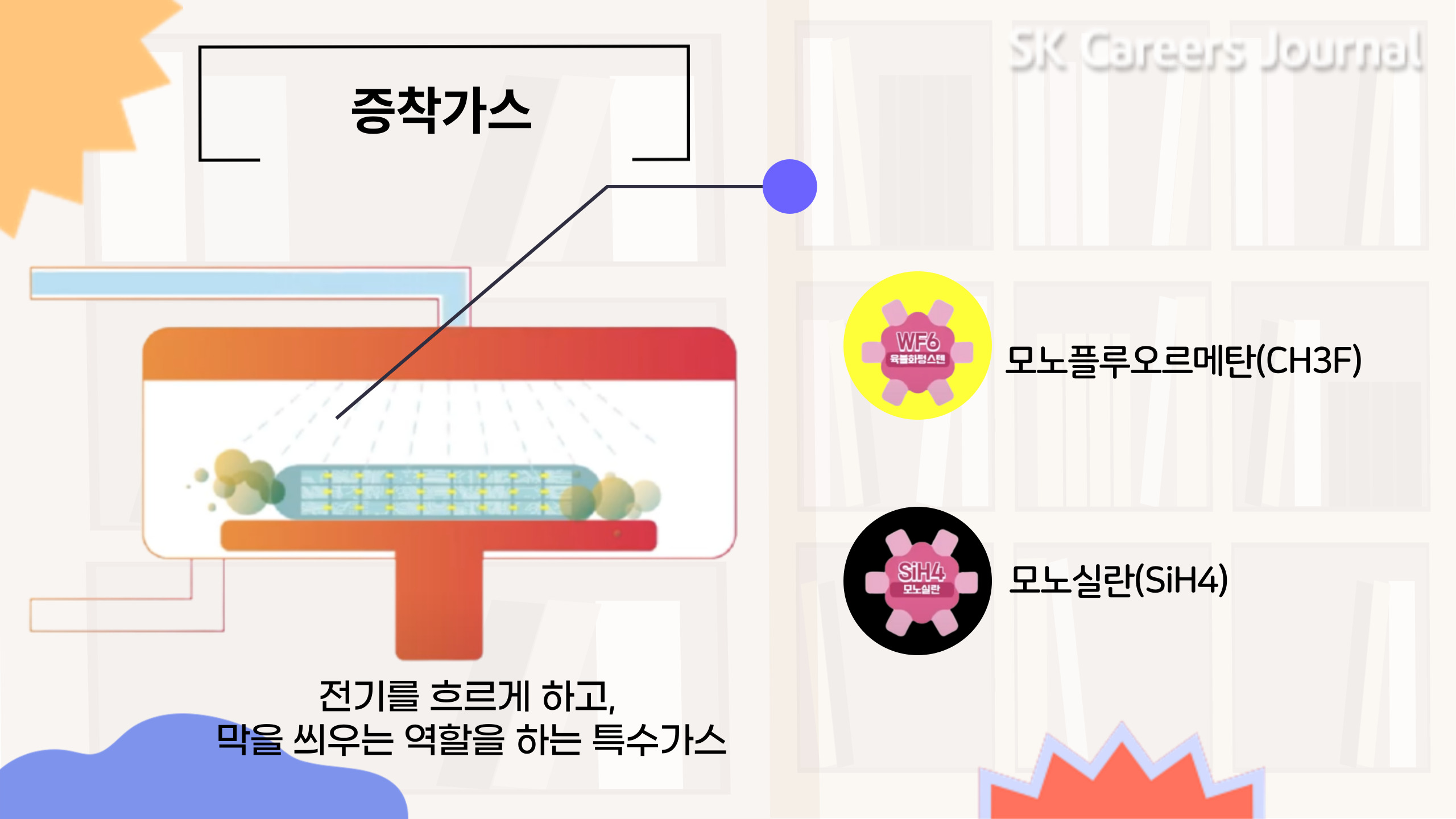 부록이 마음에 드셨나요? 처음 보는 소재들도 있고, 고객님께 익숙한 소재도 있을 거예요! 어떤 소재인지 더 궁금하시다고요? SK머티리얼즈에 관심이 있었던 고객님이시라면 오늘의 소재들은 무조건 마음에 드실 거라 확신합니다! 우선 그전 먼저 스마트폰, 스마트워치, AI 스피커, 노트북 등 우리의 삶을 편안하게 만들어주는 제품들의 공통적인 특징이 무엇인지 생각해 볼까요? 바로 반도체를 통해 작동한다는 점입니다! 뇌의 명령을 받아 신체가 움직이는 것처럼, 전자제품은 반도체의 명령을 받아 움직입니다. 정리하자면, 반도체는 우리가 조작한 대로 저항의 크기를 조절하고, 빛을 내는 등 전자제품을 움직이는 역할을 맡고 있답니다. SK머티리얼즈는 그런 반도체 생산 주요 공정에 쓰이는 특수가스를 비롯한 여러 가지 제품을 생산하고 있답니다.