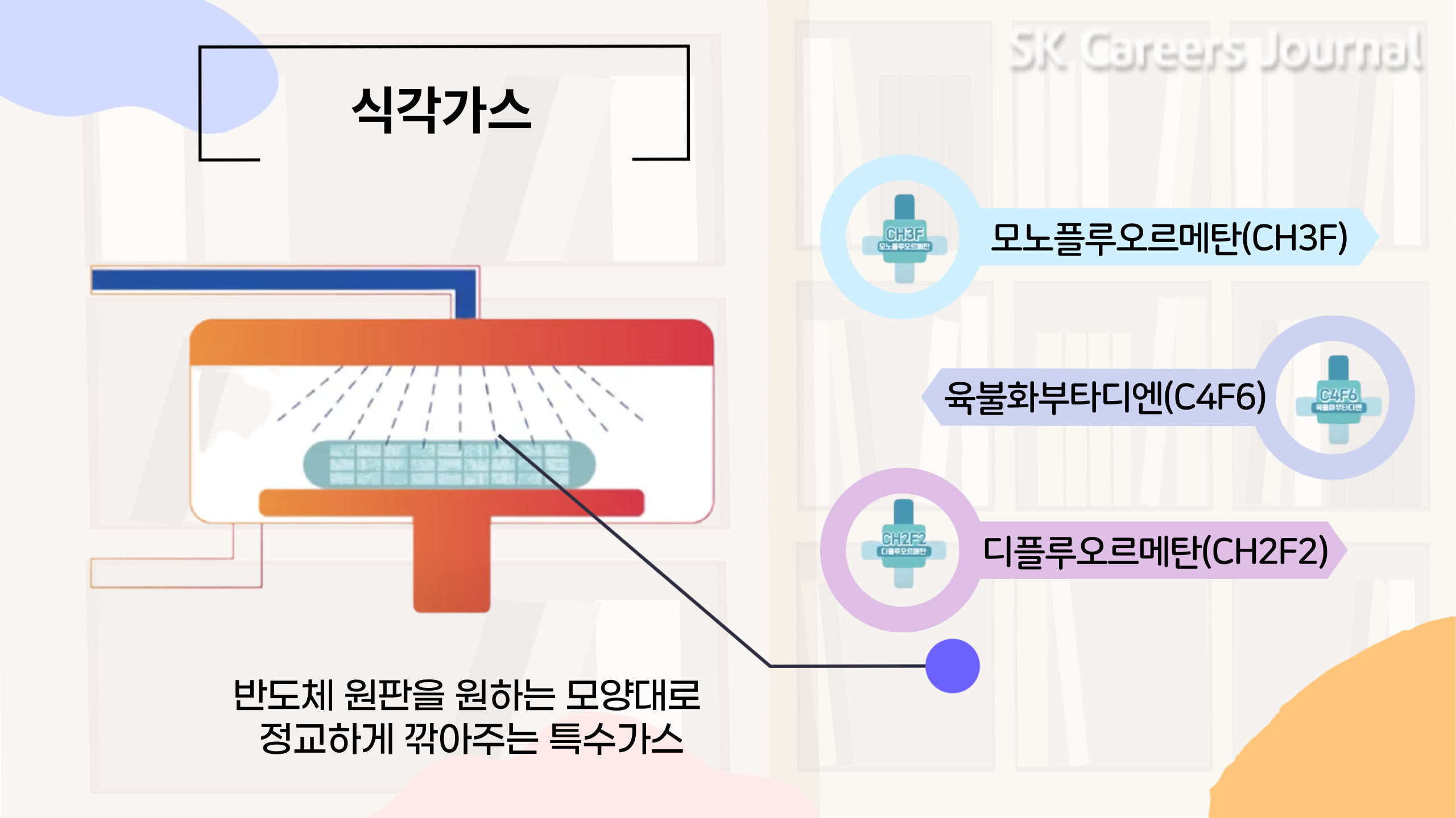 반도체 과정에 맞추어 오늘의 소재를 하나씩 설명해드릴게요! 우선적으로 반도체 제조 과정 중 첫번째는 ‘식각’입니다. 먼저, 반도체가 되기 전인 반도체 원판(웨이퍼)을 준비합니다. 이 반도체 원판을 원하는 회로 모양으로 깎는 과정을 거칩니다. 어떤 회로 모양으로 깎는지에 따라 스마트폰에 들어가는지, 노트북에 들어가는지 그 용도가 결정 된다고 합니다! 바로 이때 회로를 깎기 위해서는 특수가스가 필요합니다! 반도체 원판을 원하는 모양대로 정교하게 깎아주는 특수가스가 바로 ‘식각 가스’입니다. SK머티리얼즈에서는 모노플루오르메탄(CH3F), 육불화부타디엔(C4F6), 디플루오르메탄(CH2F2) 등 여러 가지 식각가스를 생산하고, 판매한답니다!
