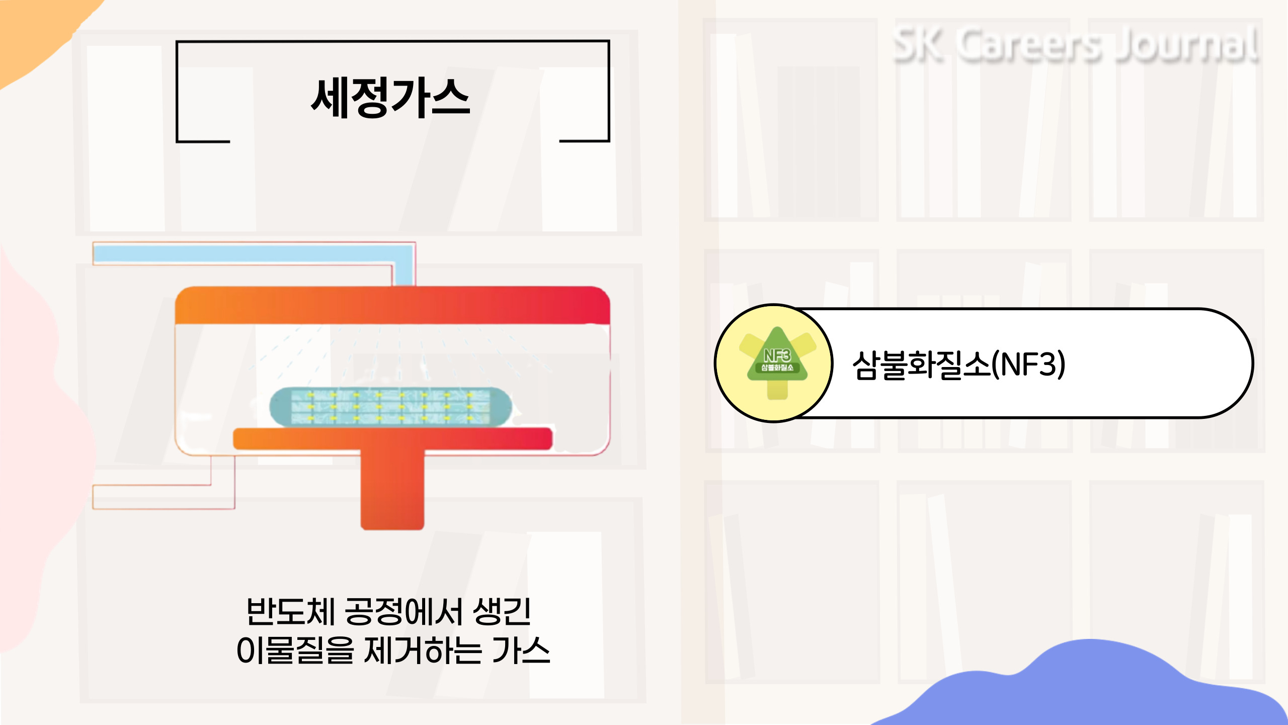 마지막으로 소개해 드릴 반도체 제조 과정은 ‘세정’입니다. 반도체와 반도체 원판은 아주 미세한 이물질에도 문제가 발생할 수 있어요. 그렇기에 모든 공정 과정에서 남은 이물질은 깨끗하게 청소해 줘야 합니다. 바로 이물질을 제거하는 과정에서도 특수가스가 사용됩니다! ‘세정가스’는 그중 반도체 공정에서 생긴 이물질을 제거하는 기능을 합니다. 가스를 SK머티리얼즈에서도 삼불화질소와 같은 세정가스(NF3)를 생산, 판매하는데요! 바로 이 삼불화질소가 SK머티리얼즈의 글로벌 No.1 Market share를 자랑하는 대표 생산 제품이랍니다. (모두 박수~)