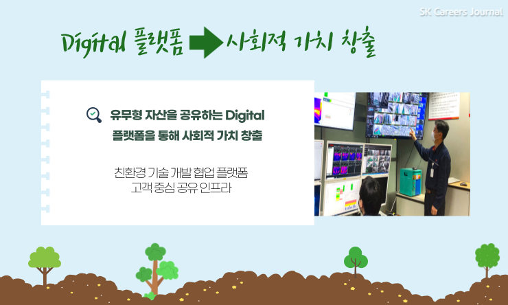 세번째 지향점은 유무형 자산을 공유하는 Digital 플랫폼을 통해 사회적 가치를 창출하는 것이에요. SK이노베이션은 이를 실현하기 위해서 두 가지 플랫폼을 구체화하고 있답니다.