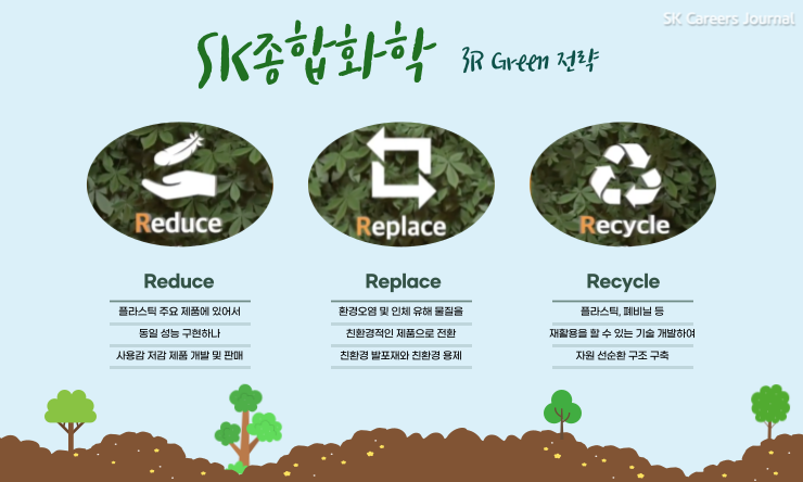 최근 폐플라스틱으로 인한 환경 문제가 심각하다는 점, 모두 알고 계시죠? 이렇게 환경 문제가 대두되면서 SK종합화학 스키노맨들 또한 문제 해결에 나섰는데요! SK종합화학은 친환경 패키징 Automative 경량화 소재 등 보유 테크를 바탕으로 고기능성 친환경 제품 비중을 확대하고 3R 활동을 통해 사회적 가치를 창출하여 지속 가능한 미래에 기여하고자 노력하고 있어요. 잠깐! 여기서 말하는 3R은 SK종합화학의 Green 전략으로서 Reduce, Replace, Recycle을 말한답니다.