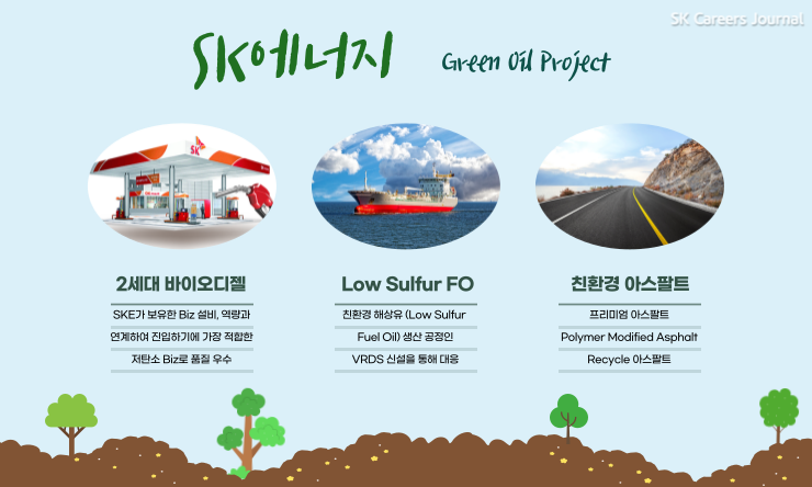 SK에너지가 현재 추진하고 있는 주요 친환경 프로젝트는 바로 Green Oil인데요. 경유, 항공유, 해상유, 아스팔트 등 기존 석유제품을 보다 환경성이 강한 제품으로 바꾸는 프로젝트죠.