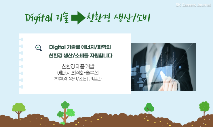 마지막은 친환경 생산/소비 인프라입니다. 아무래도 환경 문제가 점점 심각해지다보니 선진국을 중심으로 친환경 소비 및 재활용을 촉진하는 정책이 증가하고 있어요. 또한, 제품을 만드는 과정 뿐만 아니라 사용하고 버린 후에도 환경에 미치는 영향을 고려하는 고객도 증가하고 있고요. 그렇기 때문에 SK이노베이션 또한 제품 소비에 따른 탄소배출량이나 제품 라이프 사이클을 제공하는 디지털 친환경 소비를 구축해 친환경 선도 기업으로 브랜드 가치를 높이고 새로운 수익 모델 창출도 가능할 것을 기대하고 있답니다.