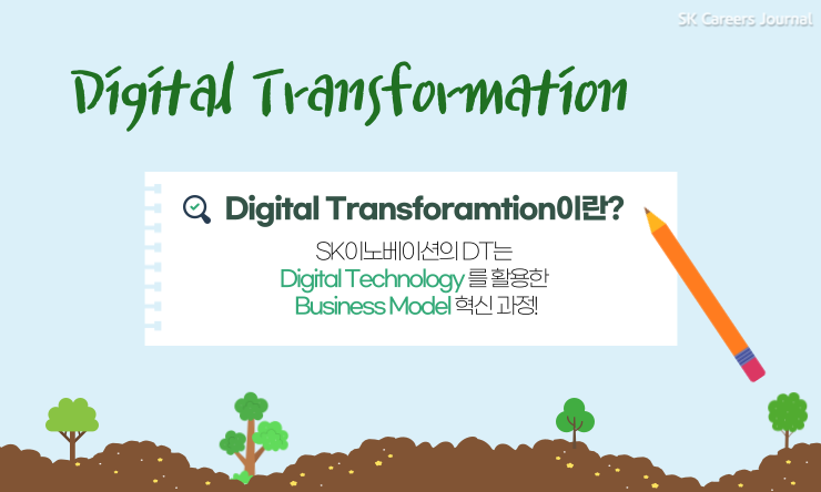 그럼 마지막 Green Balance 2030 이야기는 바로~ Digital Transformation입니다. SK이노베이션이 Digital Transformation (이하 DT) 은 그린 포트폴리오를 가속화하기 위한 Accelerator이자 Enabler인데요. 간단히 말하자면, 공정, 고객, 시장 등 다양한 데이터와 빠르게 변화하고 있는 디지털 테크놀로지를 적극적으로 활용하는 것이에요. SK이노베이션의 DT는 디지털 테크놀로지를 활용하여 BM을 혁신하는 일련의 과정인데요, 스키노 주니어들이 이해하기 쉽도록 DT를 세 가지 과정으로 정리해보았습니다!