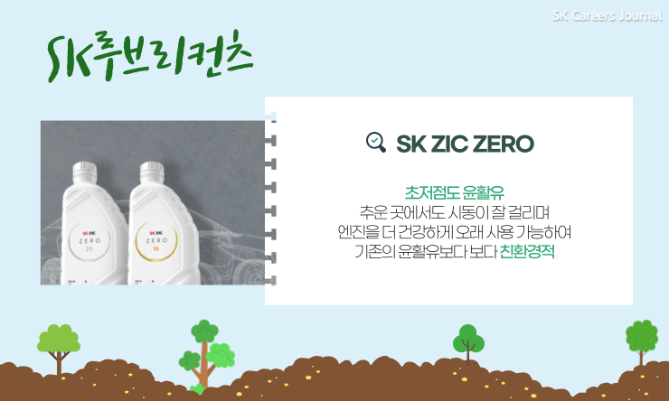 SK루브리컨츠는 2019년 11월 국내 업계 최초로 하이브리드 차량에 적합한 차세대 윤활유, 신제품 ZIC ZERO 다섯 종류를 출시하고 친환경 윤활유 시장을 선도하고 있습니다. ZIC ZERO는 기존 ZIC 대비 연비효과가 3~5% 정도 높고, SK루브리컨츠가 세계 최초로 독자 개발한 이온 액체를 활용한 제로 테크 기술이 접목된 초저점도 윤활유예요. 이러한 초저점도 윤활유는 기존 GR-3를 사용한 운활유보다 더 추운 곳에서 시동이 잘 걸리고, 엔진을 더 건강하게 오래 사용할 수 있다는 점에서 조금 더 친환경적이라고 볼 수 있답니다.