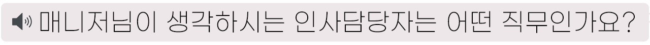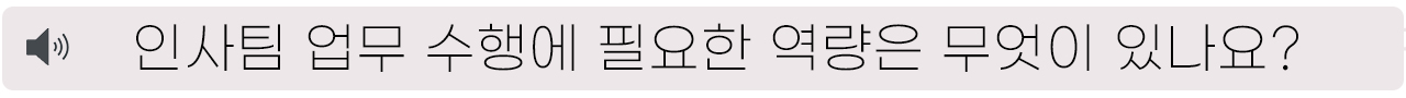 요즘은 AI/DT시대가 도래하면서 다양한 IT적 스킬과 감각이 우선 시 되고, 중요하게 여겨지고 있습니다. 인사팀에서도 해당 스킬에 대한 니즈가 점차 증가하고 있죠. 그렇지만 제가 생각하기로는, 인사담당자는 무엇보다 인간미(美)와 인간애(愛)를 가지고 있는 게 중요해요. 그래야 끝까지 초심을 잃지 않고 좋은 인사담당자로 성장할 수 있어요. 또한 사람에 대한 이해도가 높아야 하며, 커뮤니케이션(소통) 능력과 비즈니스 매너도 필수입니다. 매니저님은 그 중에 어떤 스킬이 가장 뛰어나신가요? 저는 다 갖추고 있다고 할 수 있죠.(웃음) 농담이구요, 제 경우는 사람에 대한 이해도가 높은 편이고 커뮤니케이션(소통)에 자신감을 가지고 있습니다. 그리고 어릴 때부터 눈치가 엄청 빠르다는 말 많이 들었죠.