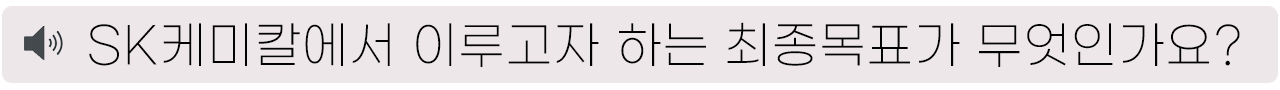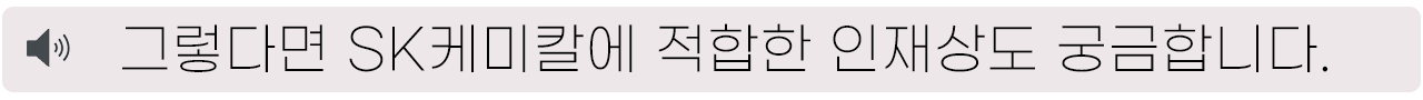 우리 회사의 인재상은 ‘따뜻한 프로페셔널’입니다. 즉, 상호 배려하는 공동체 의식을 가지고 맡은 일에 노력하는 사람을 의미합니다. 이 두가지를 갖추고 있다면 SK케미칼에 입사할 자격이 충분하죠. 저는 개인적으로 이 중에서 무엇보다 따뜻함을 의미하는 요소인 배려심을 굉장히 중요하게 생각합니다. 배려심은 팀워크와 회사 생활에 만족감을 주는 매우 중요한 가치이거든요. 경쟁심과 이기주의를 가진 사람은 조직과 팀의 사기를 저하시킵니다. 반대로 동료들을 배려하고 돕는 사람은 조직과 팀의 분위기를 따뜻하게 해주고 소속감과 업무에도 시너지 효과를 줍니다.