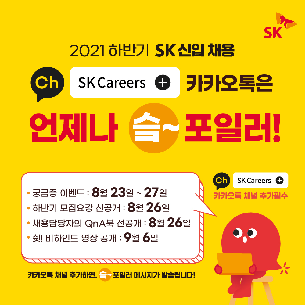 앞으로도 SK Careers 카카오톡 채널에서 SK채용 소식을 가장 빠르게 알려드립니다!💌