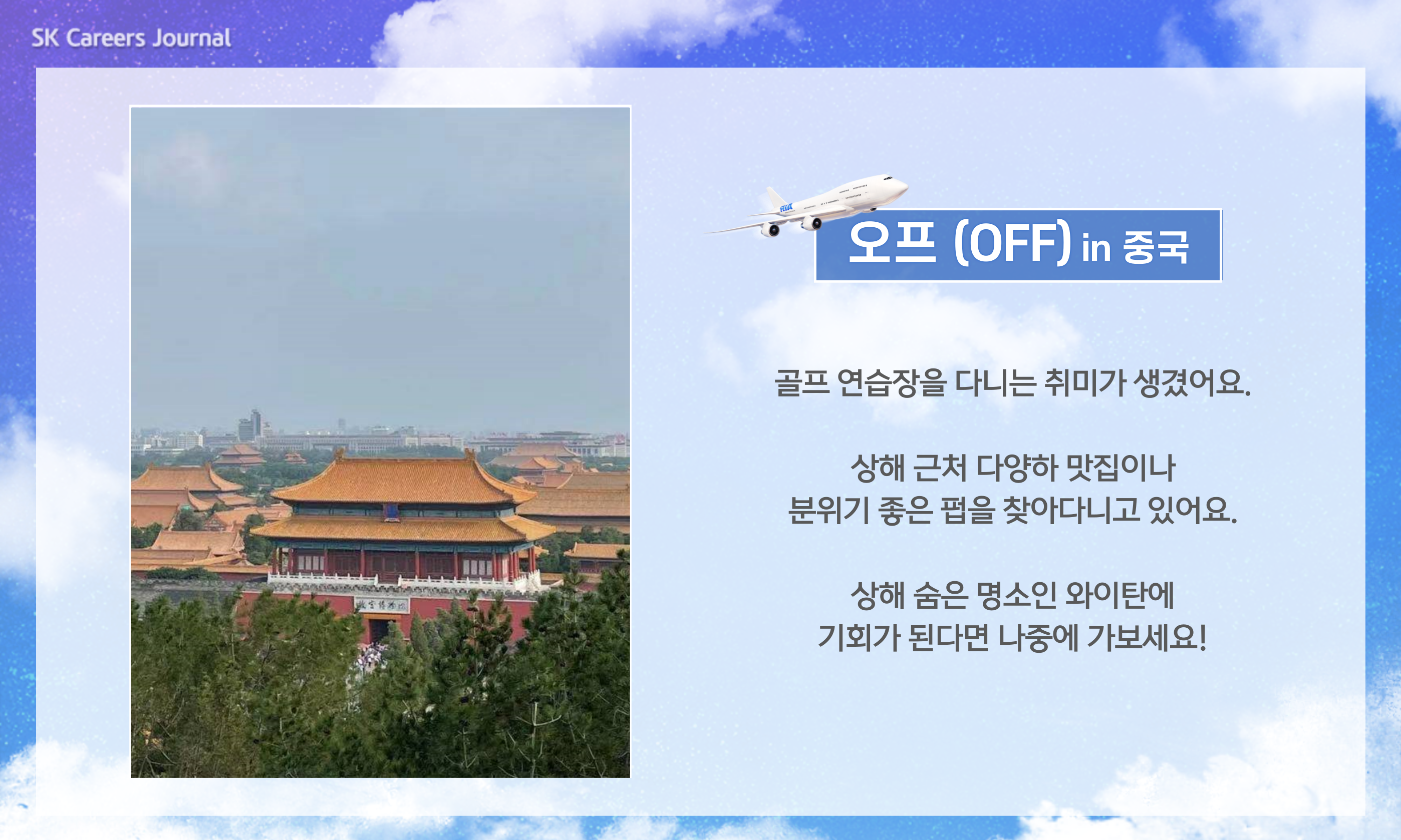 김재원 PM : 중국, 특히 상해, 북경은 코로나 청정지역이에요. 그러다보니 코로나 이전과 생활이 크게 다른 점이 없답니다. 그러다보니 업무가 잘 마무리된 날에는 열심히 돌아다니고 있어요.