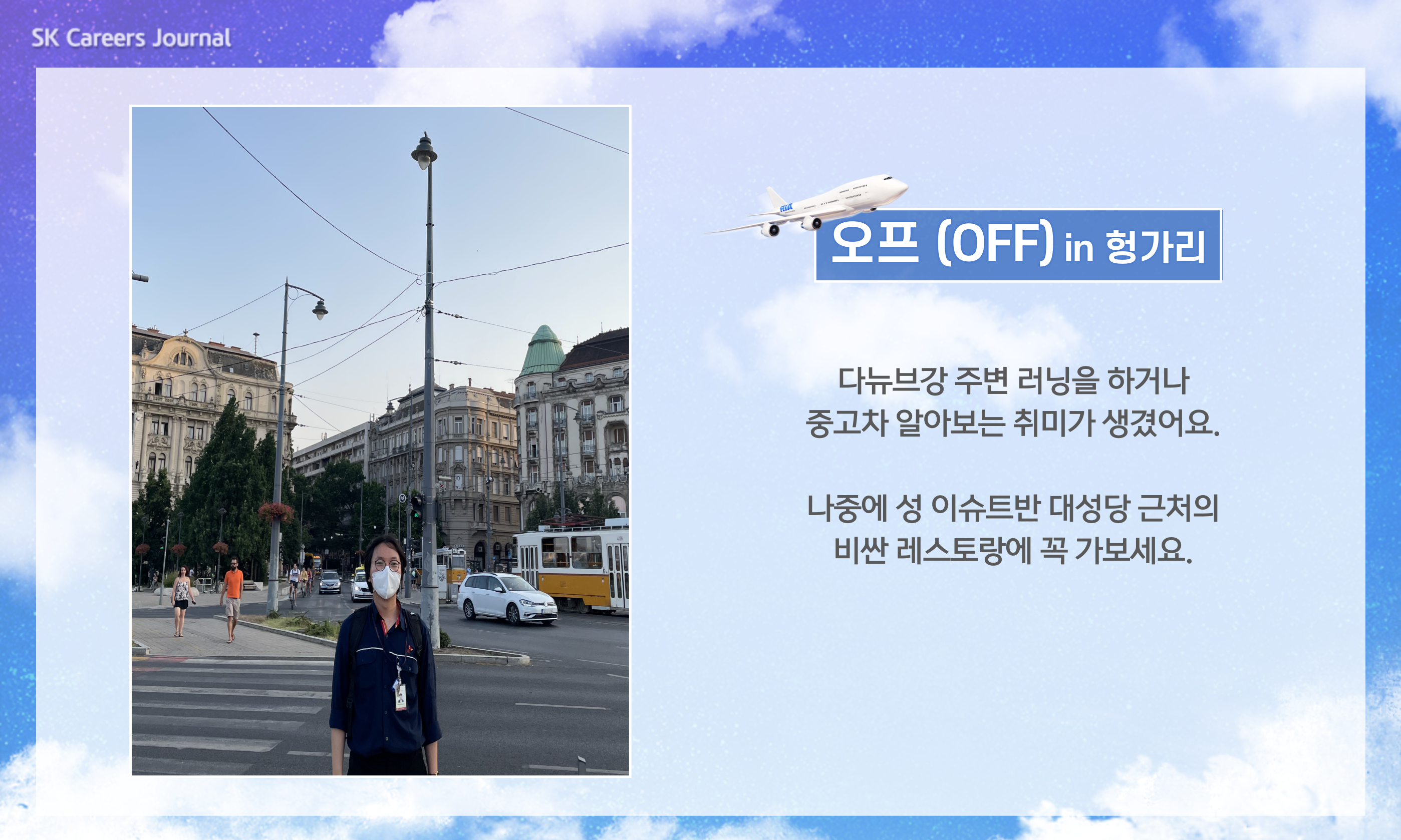 홍정균 PM : 아무래도 예전처럼 자유로운 왕래가 어렵다는 점이에요. 유럽에서의 생활을 떠올리면 주말에 잠깐 파리에 가서 쉬다 오거나 사랑하는 사람들이 여행 와 같이 놀 수 있을 줄 알았거든요. 그래도 얼마 전에 백신도 맞았고, 요즘 헝가리의 코로나 상황이 완화되고 있어 조만간 주변국 정도는 간단히 다녀와 보려고 해요. 빨리 코로나가 종식되어 모든 사람이 마스크를 벗는, 상상하기 힘든 장면이 당연해지기를 바랍니다.