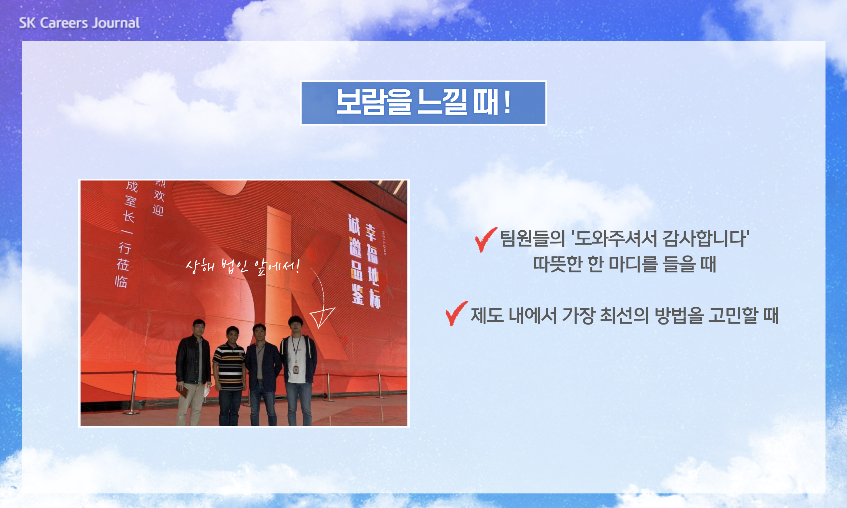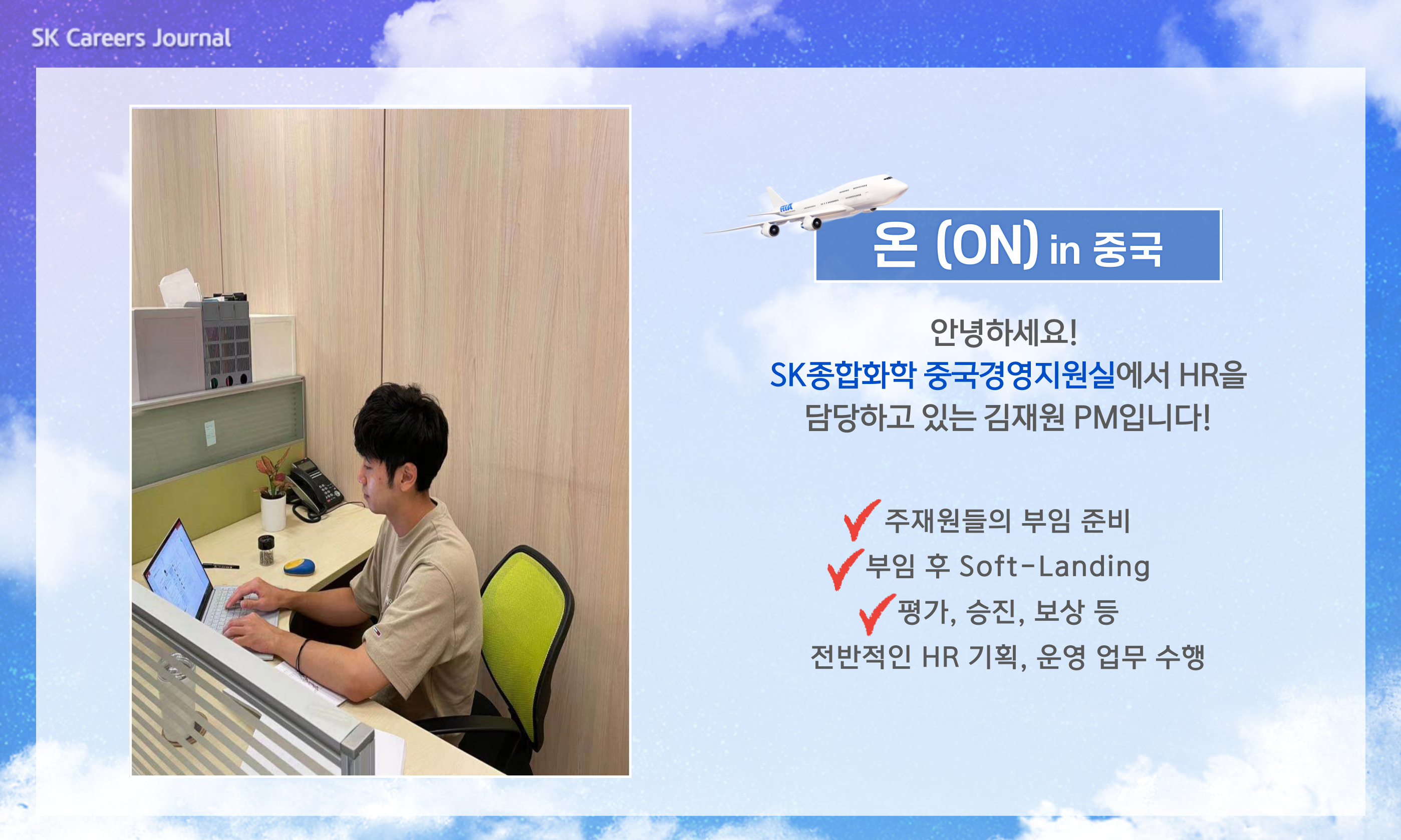 김재원 PM : 저는 중국 내 SK이노베이션 계열 전체의 HR 업무를 지원하고 있는데요. 중국 사업장으로 이동하시는 주재원분들의 부임준비, 부임 후 Soft-Landing, 귀임지원 뿐 아니라 중국 내 주재원 분들의 voice를 듣고 해결해 드리는 해결사와 같은 역할도 맡고 있답니다. 뿐만 아니라, 중국 현지에서 채용된 구성원분들의 평가, 승진, 보상 등 전반적인 HR 전 영역에서의 기획, 운영을 담당하고 있습니다.
