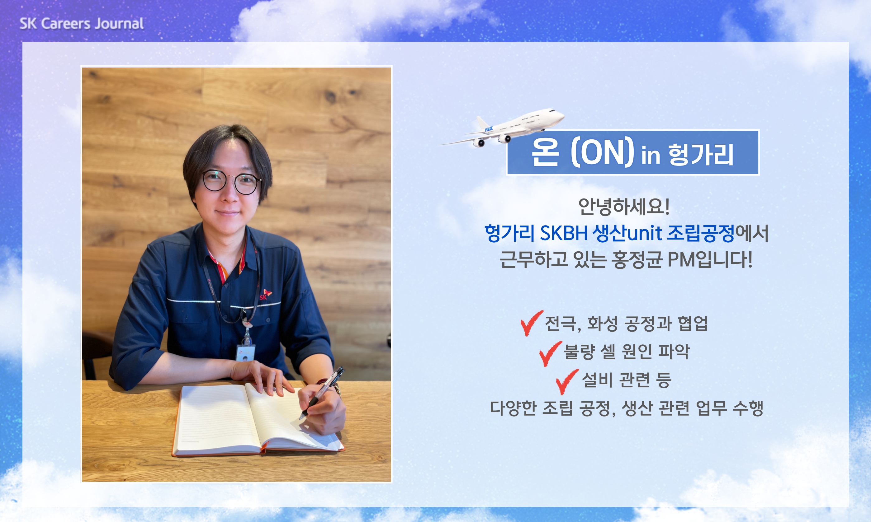 홍정균 PM : 안녕하세요, 작년 SK이노베이션 Battery생산기술본부로 입사해 올해 1월부터 SK Battery Hungary에서 주재원으로 일하고 있는 홍정균 PM입니다. 정신없이 일하다 보니 벌써 2년 차가 되었네요.