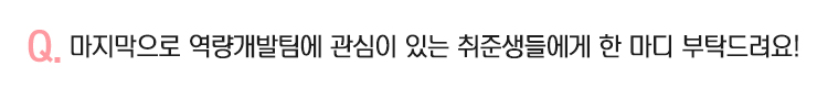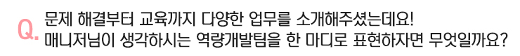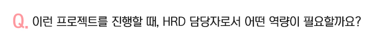 일단 문제해결능력이 필요해요. 역량개발팀은 단순히 교육만 담당하는 팀이 아니기 때문에, 마치 컨설턴트처럼 조직 내에 표면적으로 나타난 문제를 파악하고 척척 해결해 나갈 수 있는 능력이 중요하죠.